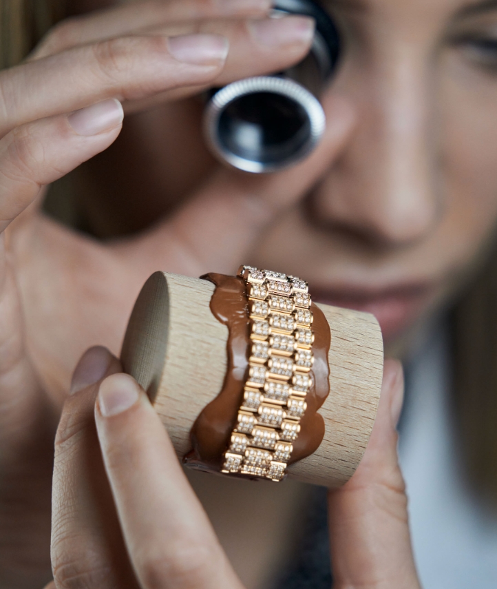 Simply setting the 44 brilliant-cut diamonds that adorn the bezel is a meticulous, time-consuming process. With movements as precise as watchmakers, the gem-setter takes a diamond and places it into a groove in the bezel. If the gem is a fraction of a millimetre too high, he removes it, and then scoops an infinitesimal shaving of metal from the cavity with a graver. The stone is then reset, and the whole ritual is repeated if necessary, until each and every one of the 44 gems are all sitting at a height with no more than 2 hundredths of a millimetre in variance with each other.
